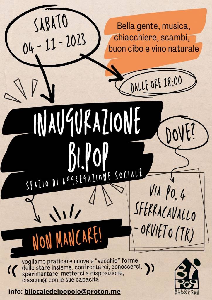 Due parole in croce per invitarvi all’inaugurazione del Bi.Pop – Bilocale del popolo a Sferracavallo, Orvieto (via Po, 4): uno spazio di aggregazione sociale dove «praticare nuove e vecchie forme dello stare insieme, confrontarci, conoscerci, sperimentare, metterci a disposizione, ciascunə con le sue capacità».